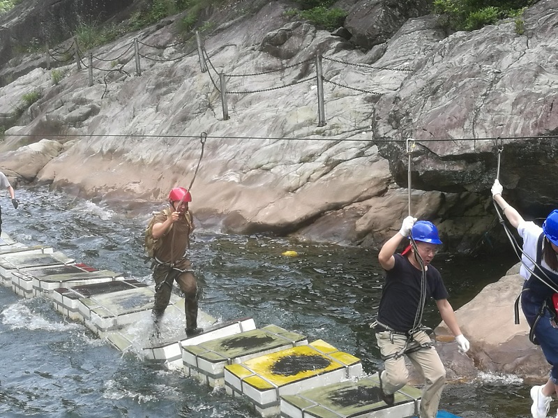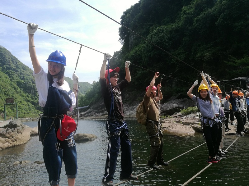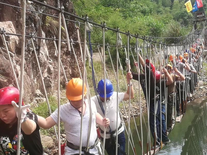 拓展活动的第二站——勇士乐园。位于九鲤溪的上游,在风景秀丽长约2公里的峡谷里设有缅甸桥、抽板过河、飞檐走壁、搭索过涧、飞夺泸定桥、携手并进、穿越绳网、高空溜索、凌空漫步、水上飞等十多个激发个人潜能,锤炼意志品质,熔炼团队精神的经典户外运动体验项目。这些体验项目的情境设计和寓乐于游的参与模式,把游览峡谷山光水色和体验户外运动完美融合,让本次活动真正“动”起来。